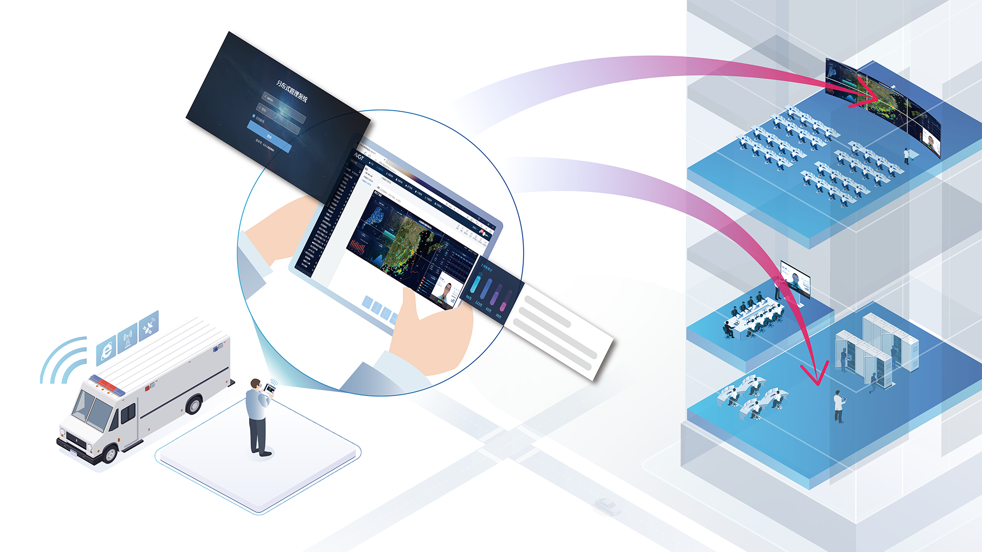 在領導、專家小組出差、遠赴異地園區進行指揮生產情況下,通過可視化B/S運維管控平臺,在移動手持終端上即可異地遠程查看指揮中心各個業務平臺的圖像數據,同時對大屏顯示內容進行實時可視化調度,解決機動部署導致指揮中心與異地現場信息不對稱問題。