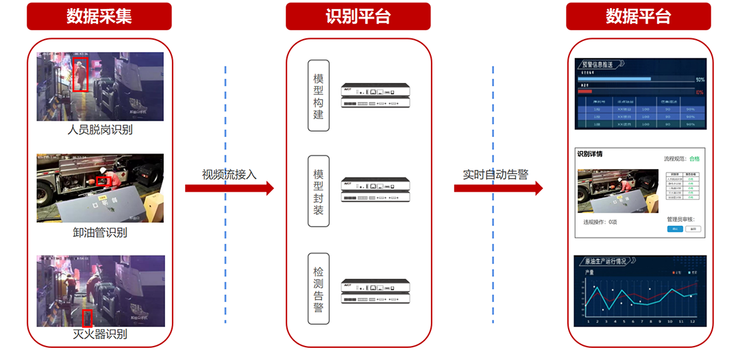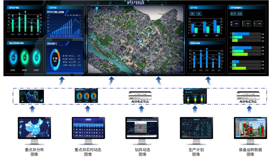 將AI分布式節點、圖像識別分析技術與石油化工指揮中心業務應用場景高度融合,打造AI大數據可視化分析平臺。通過采集各業務平臺視頻流圖像,結合AI圖像識別分析技術快速提取各業務平臺生產數據,生成直觀的大數據可視化圖表進行呈現,整合多個業務平臺的數據進行融合展示,實現一張圖綜合態勢展示、一張圖實時監測、一張圖聯動處置。