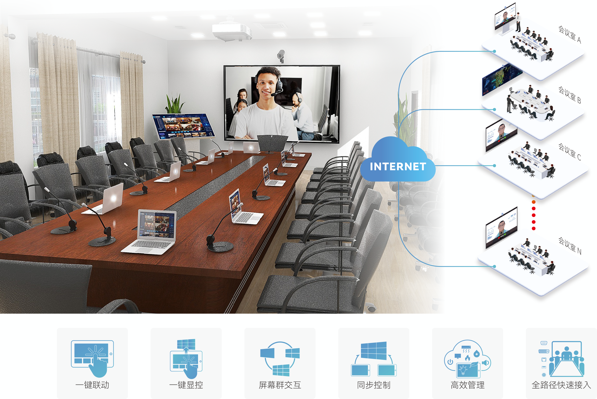 設備自帶控制接口,可直接實現對周邊設備的管理控制,并可根據場景不同,提前預設各種模式,實現大屏、攝像頭、話筒、無紙化升降屏、投影儀等設備一鍵聯動控制,同時支持環境狀態實時反饋與自動調節,讓參會者始終處于舒適的會議環境。