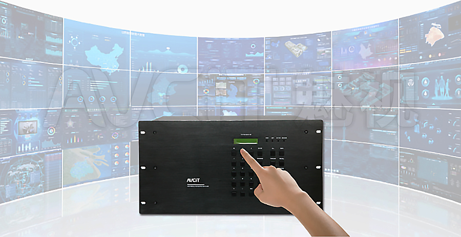 最初人與視音頻設備交互的方式主要為按鍵控制,設備一般具有各種不同的功能按鍵。以“信號切換”為例,要實現矩陣切換信號功能時,按照一定邏輯順序觸發對應按鍵即可。除切換之外,還具備簡單模式保存/調用、狀態查詢等功能性按鍵供用戶使用。部分設備還具有一塊LED顯示屏,供使用者簡單讀取設備相關狀態。