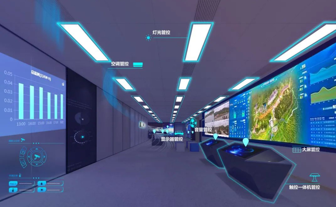 通過DS.X分布式綜合管控平臺,將園博園指揮中心及各會議室受控系統和設備的功能匯聚,從而便于用戶對各系統功能統一調配控制,實現硬件資源和系統功能的整合集成。用戶可通過終端可視化觸摸操作或語音識別等方式實現信號上墻,燈光、窗簾、擴聲、設備開關、會議系統、空調系統等功能控制;同時還實現了受控系統和設備定時控制、自感應互聯、設備偵測(如溫度、濕度、PM2.5等環境設備的實時狀態反饋)和狀態報警等功能。