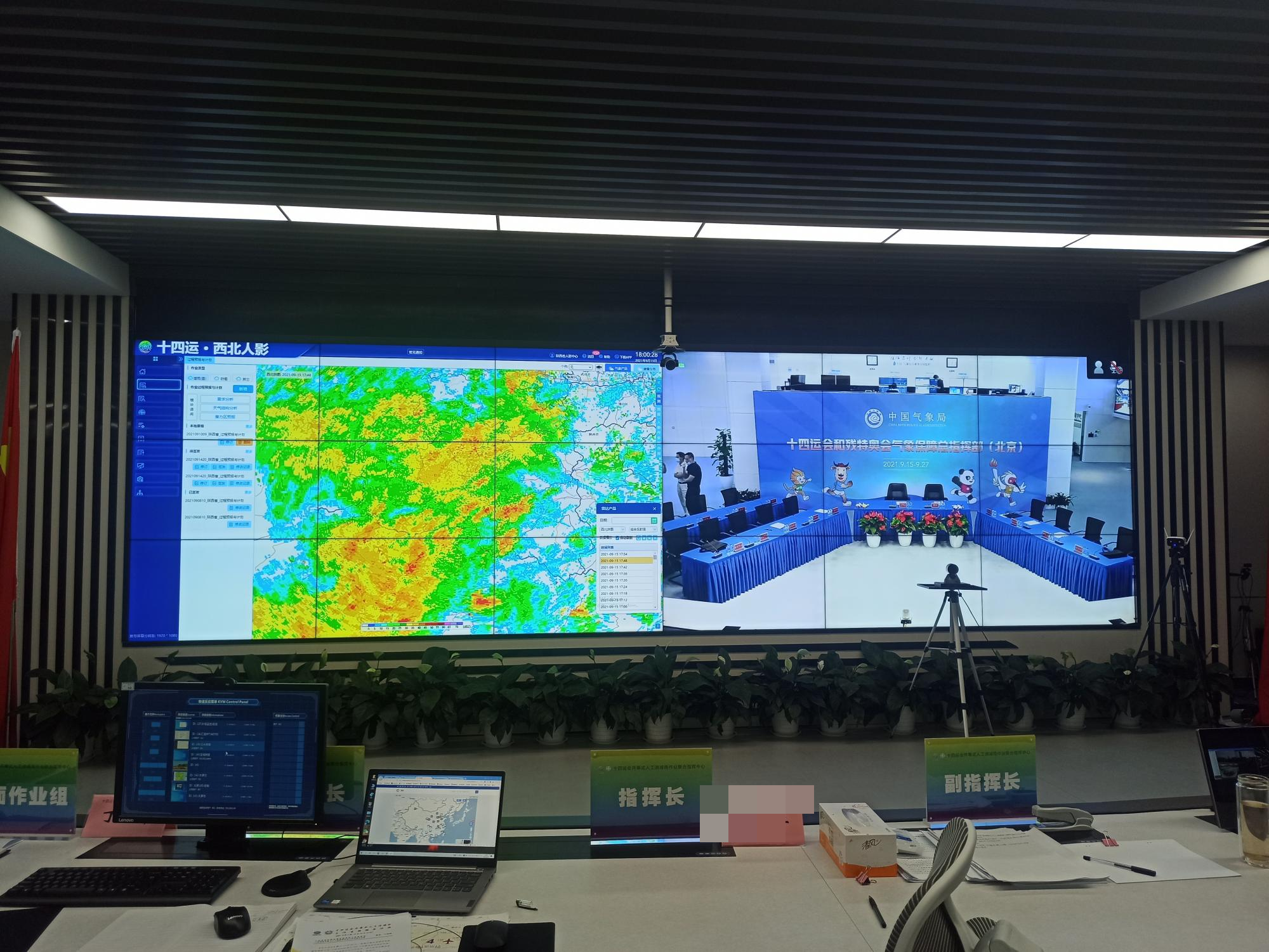 陜西氣象動態監測云圖和中國氣象局北京總指揮部視頻會議遠程指揮調度正同時進行