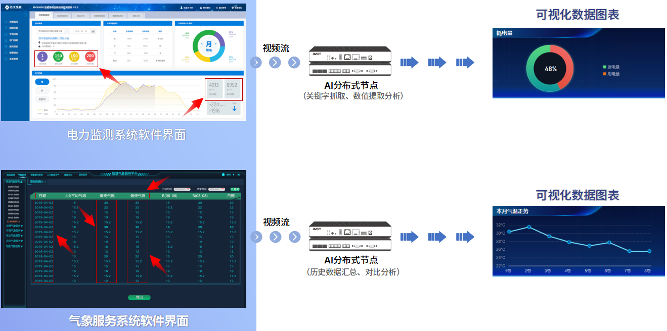 魅視AI大數(shù)據(jù)可視化平臺以AI分布式節(jié)點(diǎn)為支撐、音視頻流數(shù)據(jù)為中心,兼具強(qiáng)大AI算力和編解碼能力,通過應(yīng)用圖像識別與分析技術(shù)、分布式計算技術(shù)等,實時采集用戶的業(yè)務(wù)軟件界面并進(jìn)行分析,計算得出目標(biāo)數(shù)據(jù),最終整合匯總,并以可視化圖表方式進(jìn)行展示。