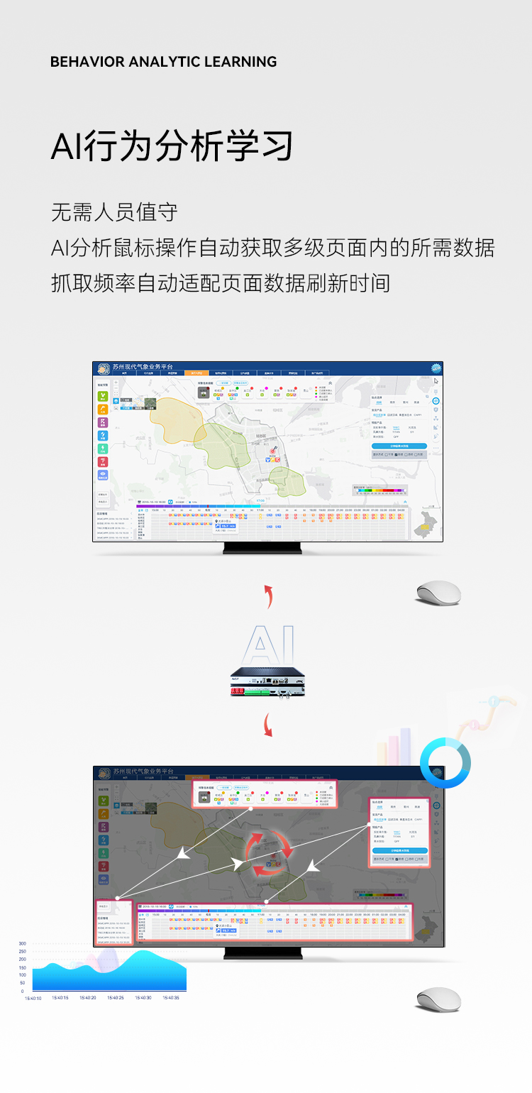 無需人員值守,AI分析鼠標操作自動獲取多級頁面內的所需數據,抓取頻率自動適配頁面數據刷新時間。