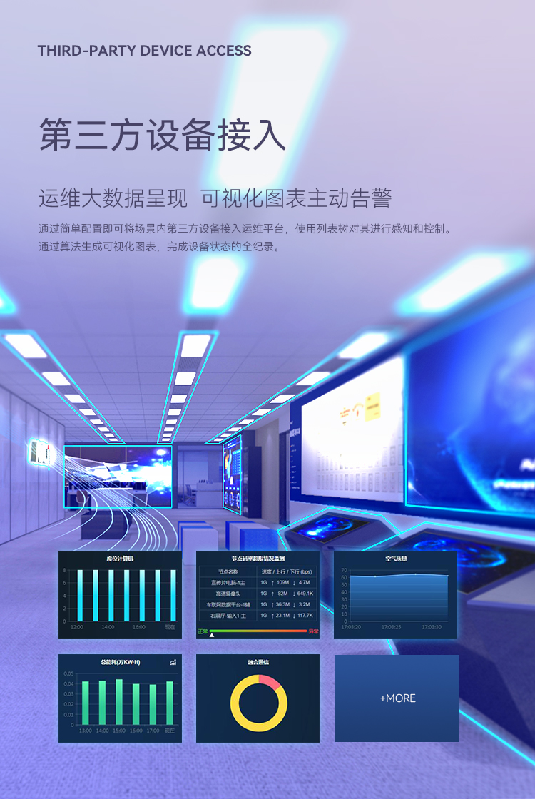 通過簡單配置即可將場景內第三方設備接入運維平臺,使用列表樹對其進行感知和控制。通過算法生成可視化圖表,完成設備狀態的全紀錄。