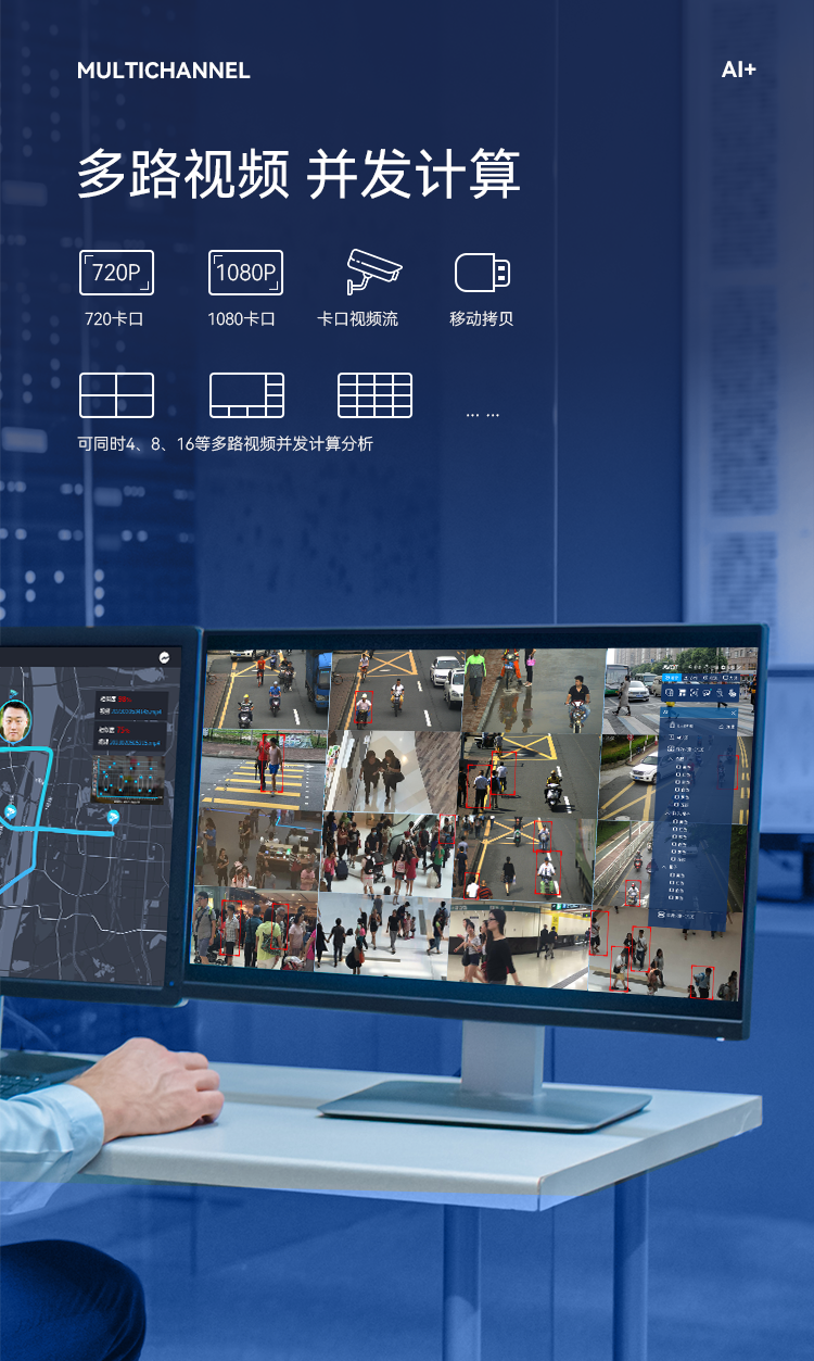 可對常規的720P、1080P等規格的高清卡口視頻流、移動拷貝視頻流自動實時分析,并通過深度識別、目標檢測、軌跡跟蹤等專業算法智能分析。 可同時4、8、16等多路視頻并發計算分析。