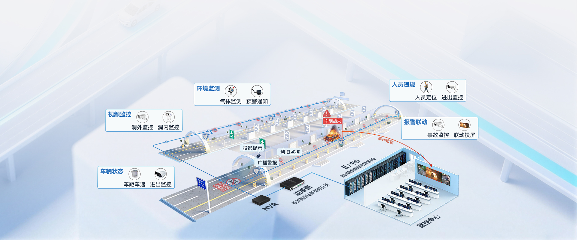 覆蓋洞內(nèi)外視頻監(jiān)控、環(huán)境監(jiān)測、車輛狀態(tài)及人員違規(guī)檢測,