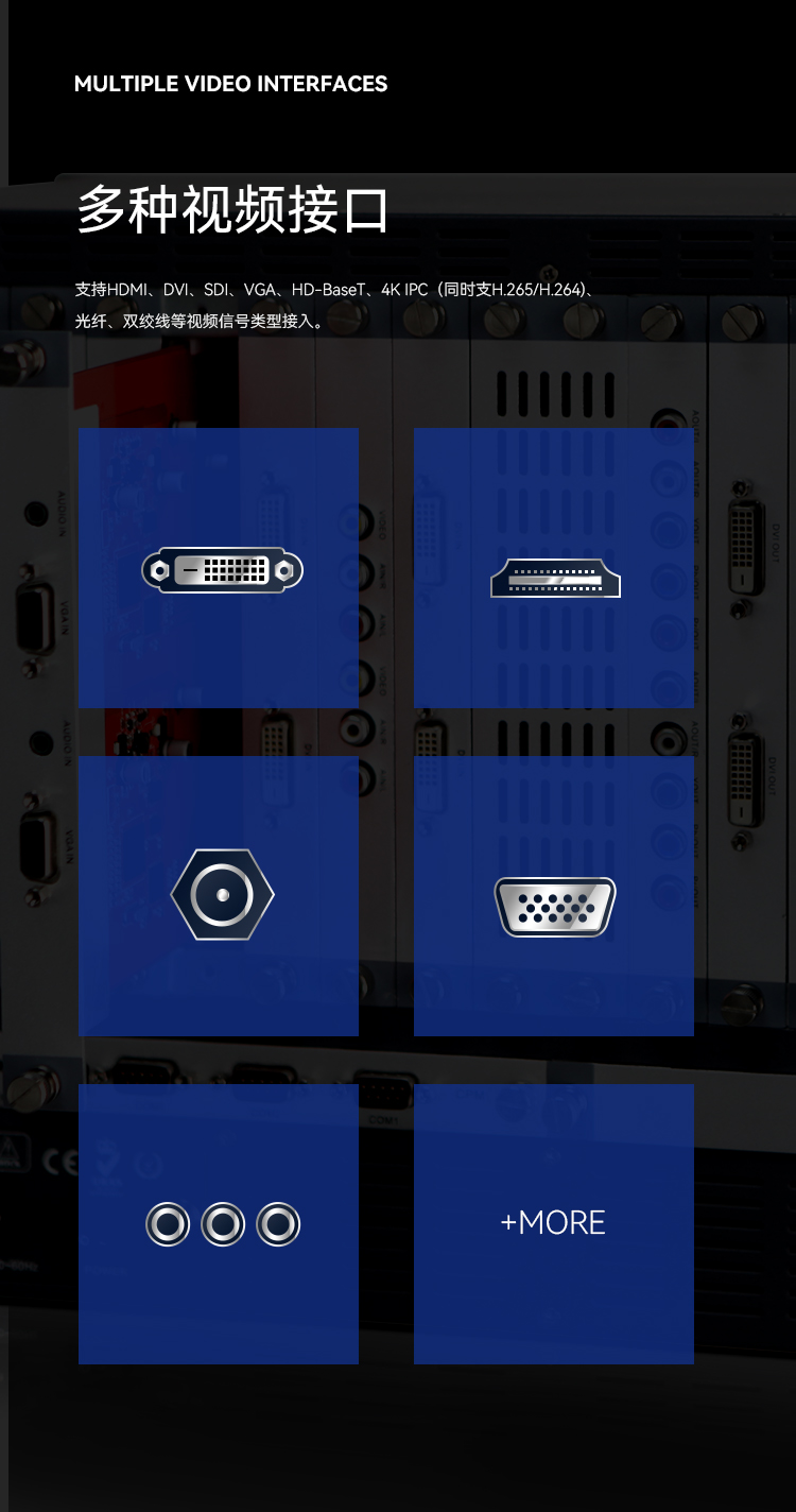 支持HDMI、DVI、SDI、VGA、HD-BaseT、4K IPC(同時支H.265/H.264)、光纖、雙絞線等視頻信號類型接入。