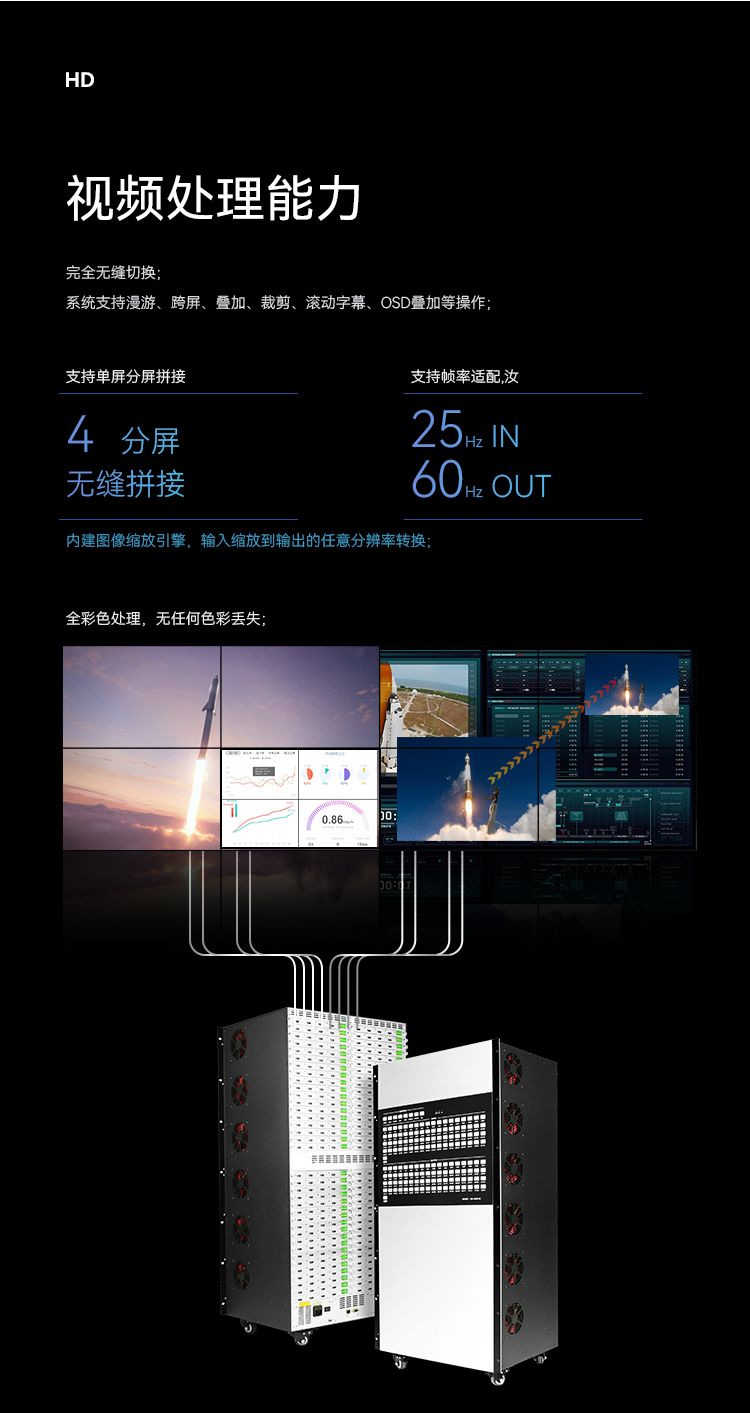 支持單屏4分屏拼接;系統支持漫游、跨屏、疊加、裁剪、滾動字幕、OSD疊加等操作;完全無縫切換;全彩色處理,無任何色彩丟失; 支持幀率適配(如輸入25幀輸出60幀),內建圖像縮放引擎,輸入縮放到輸出的任意分辨率轉換;