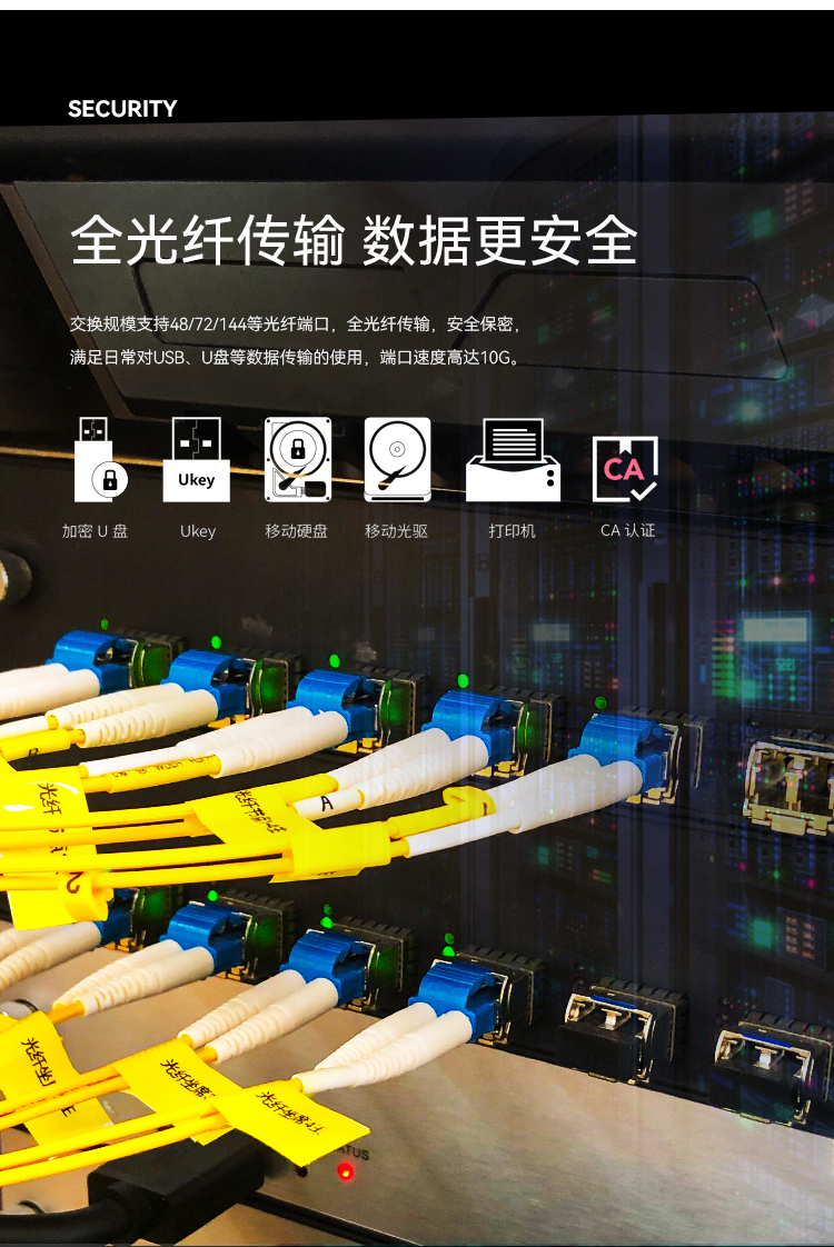 交換規模支持48/72/144等光纖端口,全光纖傳輸,安全保密,滿足日常對USB、U盤等數據傳輸的使用,端口速度高達10G。