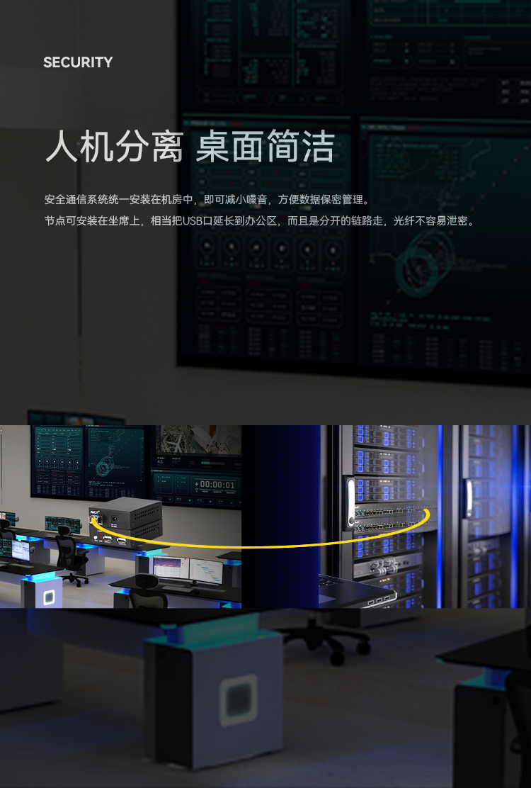 安全通信系統統一安裝在機房中,即可減小噪音,方便數據保密管理。節點可安裝在坐席上,相當把USB口延長到辦公區,而且是分開的鏈路走,光纖不容易泄密。